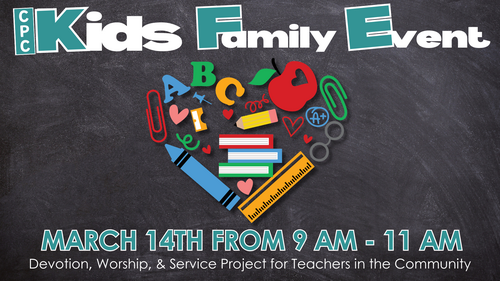 Join us for our first CPC Kids Family Event of 2026 on March 14 from 9–11 AM! We’ll begin with family worship and a short devotion, then serve our community teachers through a hands-on service project. All ages are welcome, bring the whole family!